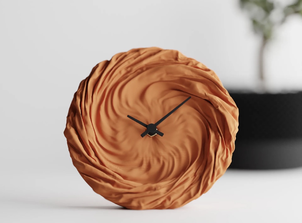 Swirl ist eine skulpturale Wanduhr, deren wirbelnde Oberfläche Bewegung und Tiefe in einer ruhigen, organischen Form vereint. Die kreisförmig verlaufenden Strukturen erinnern an fließende Materie und lassen das Objekt lebendig wirken, ohne seine Klarheit zu verlieren. Im 3D-Druck gefertigt, entsteht ein spannender Kontrast zwischen präziser Technik und einer beinahe handgeformten Anmutung.